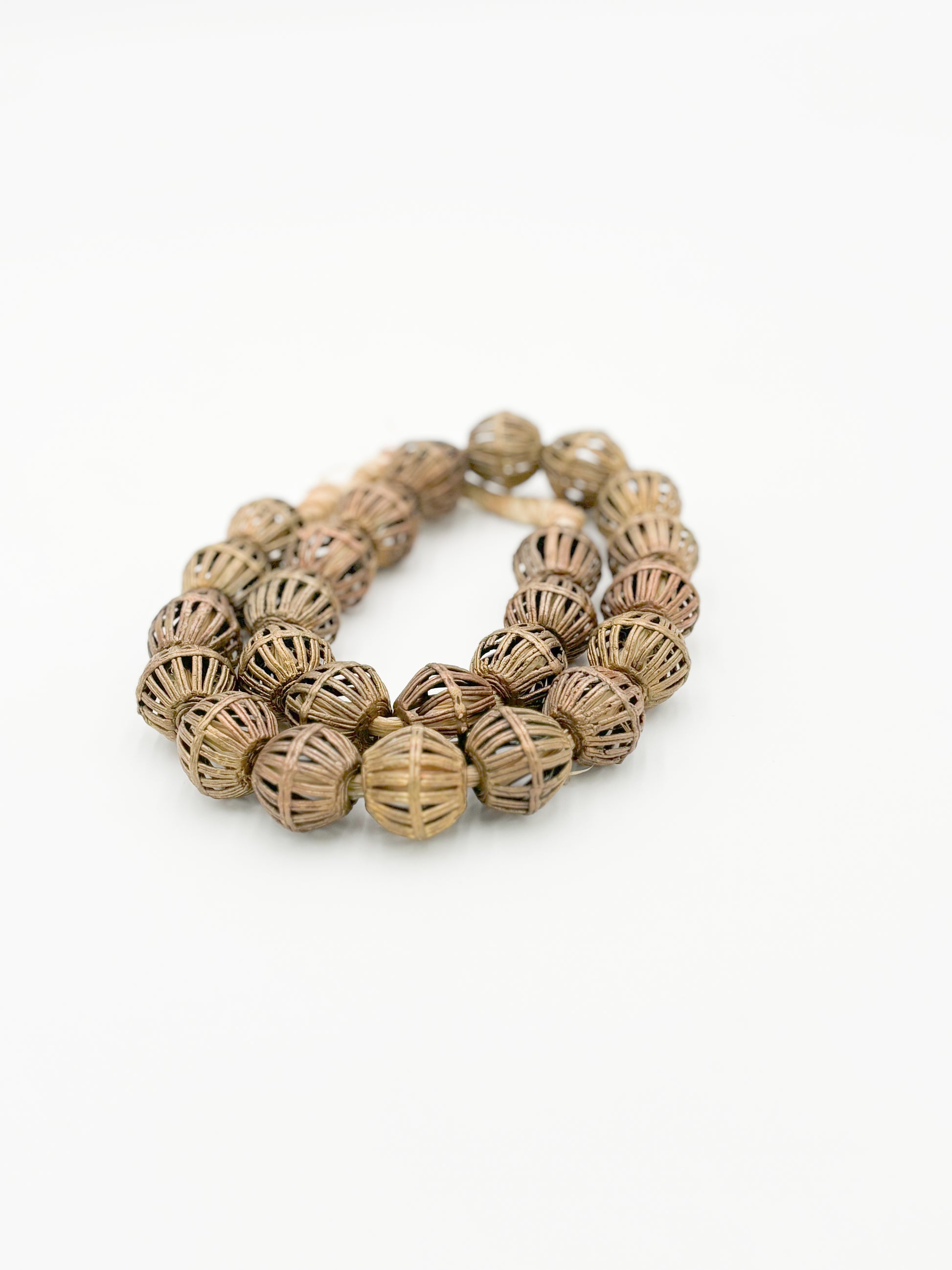 The Brass Beads Mix Style are individually crafted through a "lost wax process." Done by artisans in Ghana, the process involves pouring molten metal into a wax mold. The selection includes Baule and Round Filigree designs. The Baule beads, in particular, are increasingly challenging to source. The bead design will vary. Style and shape will vary.