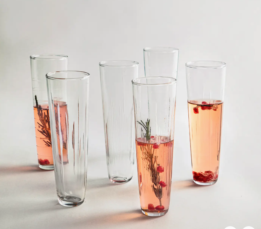 Tall and slightly flared flutes feature hand-etched patterns that set them apart from typical drinkware offerings. Skilled artisans craft them from new glass, then carefully etch patterns of lines and grooves around their exteriors. Each set of six contains two flutes in each of the three designs.
