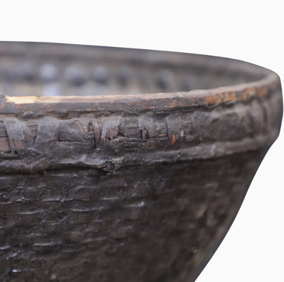 The Karnataka state is situated in the southwest region of India where our vintage bamboo Indian Picking Baskets are crafted. Hand-made in tribal villages and known locally as “tokris,” each Indian Picking Basket has a natural blackened patina and a diameter ranging from 8 to 20 inches. This is a vintage item. Condition, size, and color will vary. Approx. 8” to 20” tall
