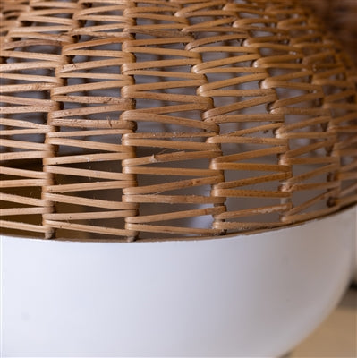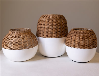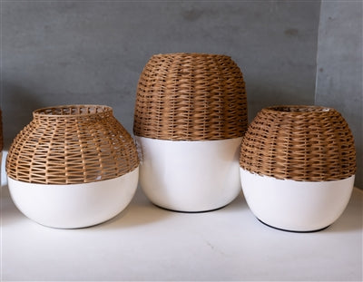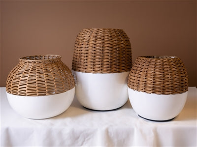 This charming Vase constructed of iron and cane is perfect for showcasing dried floral arrangements or as a sand alone piece. Its earthy, handcrafted design adds a touch of rustic elegance to any setting, blending seamlessly with various decor styles. The vase's natural finish enhances its artisanal appeal, making it a versatile and timeless addition to your home.