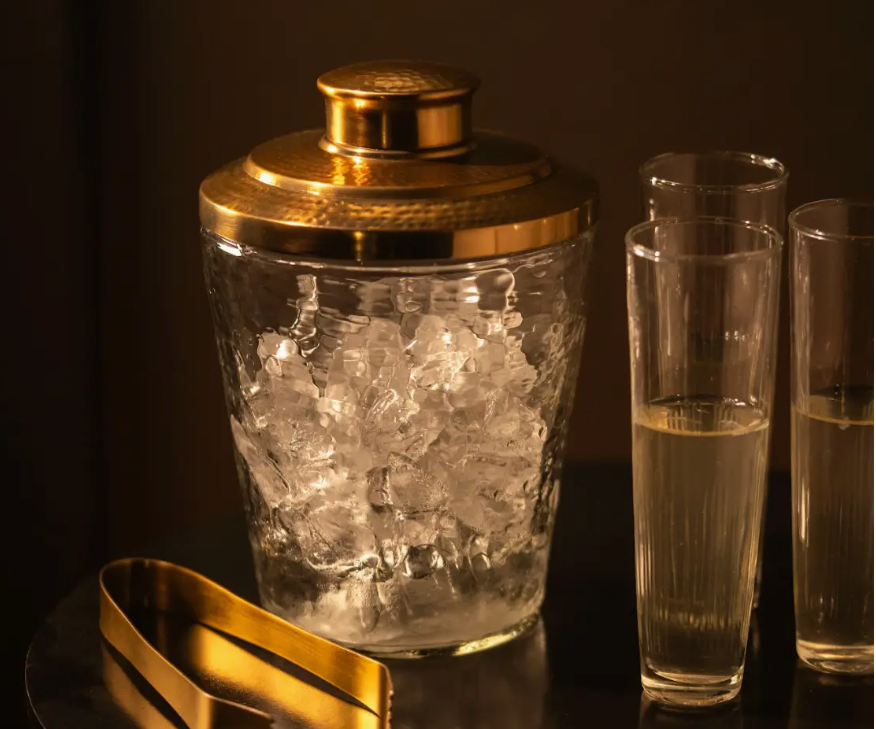 Keep cubes at the ready with our new Pebbled Glass Ice Bucket Set, which includes brushed brass tongs. Like an oversized cocktail shaker, the flared bucket is topped by a hammered brass lid that complements the tongs for a cohesive cocktail hour look.