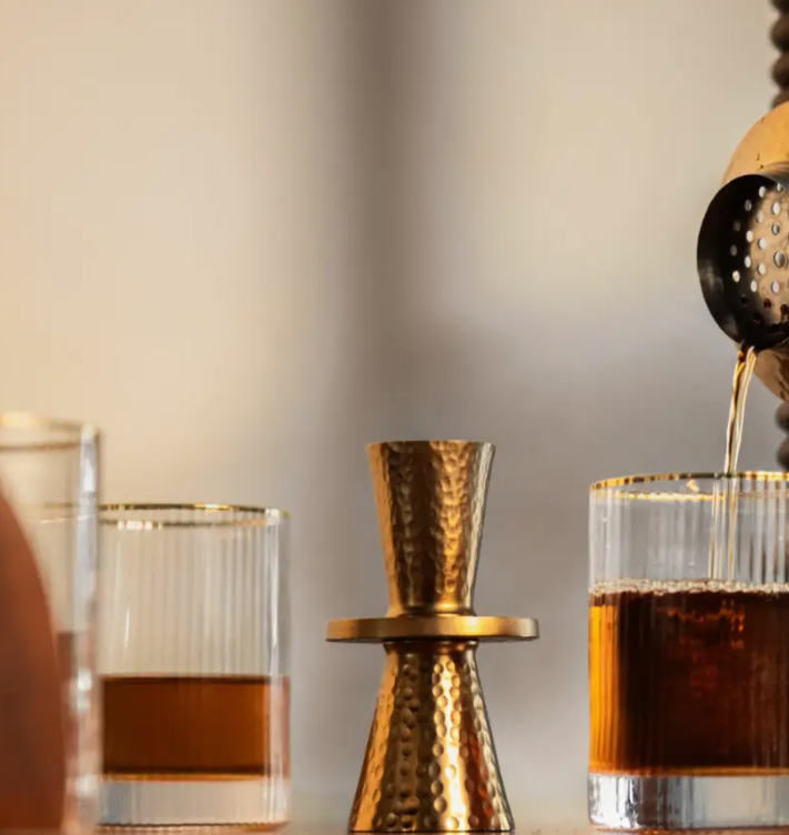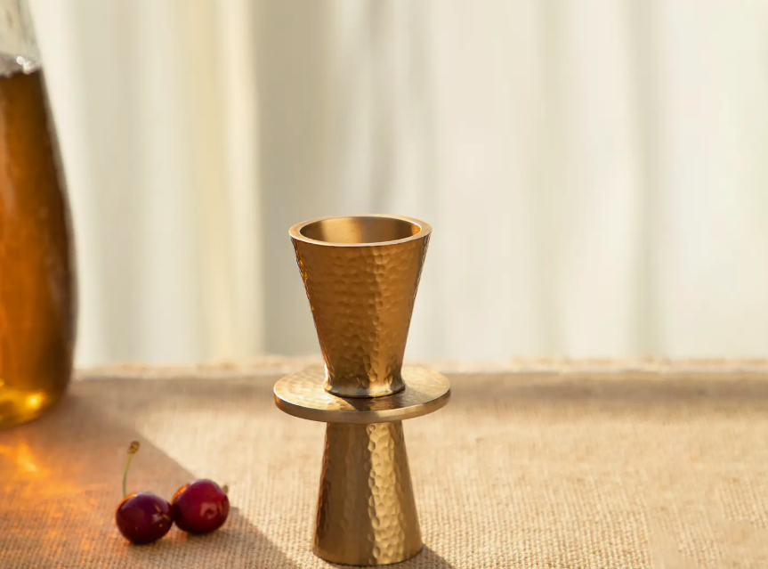 This indispensable bar tool measures 15ml shots on one end, and 30ml shots on the other, ensuring a perfect pour every time. Handcrafted from brass-finished aluminum embellished with a gently hammered texture, this calibrated double jigger is a perfect complement to our cocktail shaker, decanter, and long spoons, and an essential component of any home bar. Dimensions: 2 1/4" dia x 4 1/4" h Weight: 6 oz.