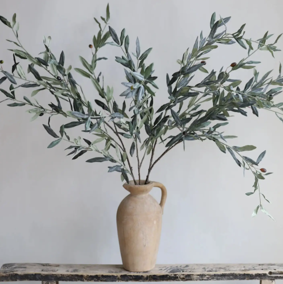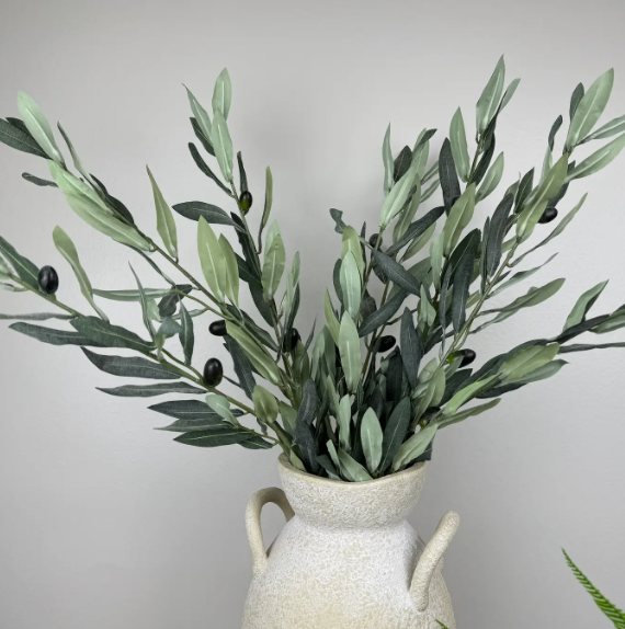 Artificial Olive Branch, frosty coated real touch leaves with flexible stems. Dimensions: * More leaves option: 34" with 76 real touch thick leaves and 6 fruits. - The stem thickness is 0.5", lifelike and fully wired for flexible shaping * Short Stem: 28" with 76 real touch thick leaves and 6 fruits. - The stem thickness is 0.125", lifelike and fully wired for flexible shaping